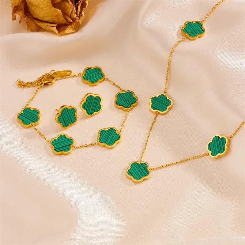 Indulge in timeless elegance with our exquisite Titanium Steel 18K Gold jewellery set featuring captivating acrylic inlays. This stunning collection includes a necklace, earrings, and a bracelet, each meticulously crafted to perfection. The enduring strength of titanium steel provides a solid foundation for the luxurious 18K gold plating, while the vibrant acrylic inlays add a contemporary touch. Elevate your style with this sophisticated set that effortlessly transitions from day to night.